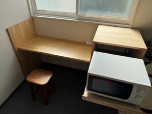 今年の初めに新たに綺麗にした休憩室。前半はかなりバタバタして忙しく、ほったらかしにしていて冷蔵庫と電子レンジがバラバラに置かれていたので、シンク横にまとめて移動させてお昼ご飯も座って食べられるようにとその横に天板も据え付け。