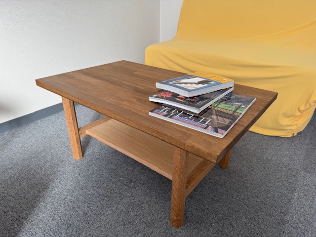 休憩室のソファカバーの山吹色と意外とマッチしてて空間にも合っているような気がしています。