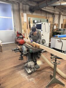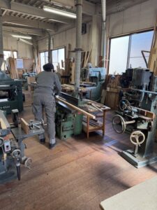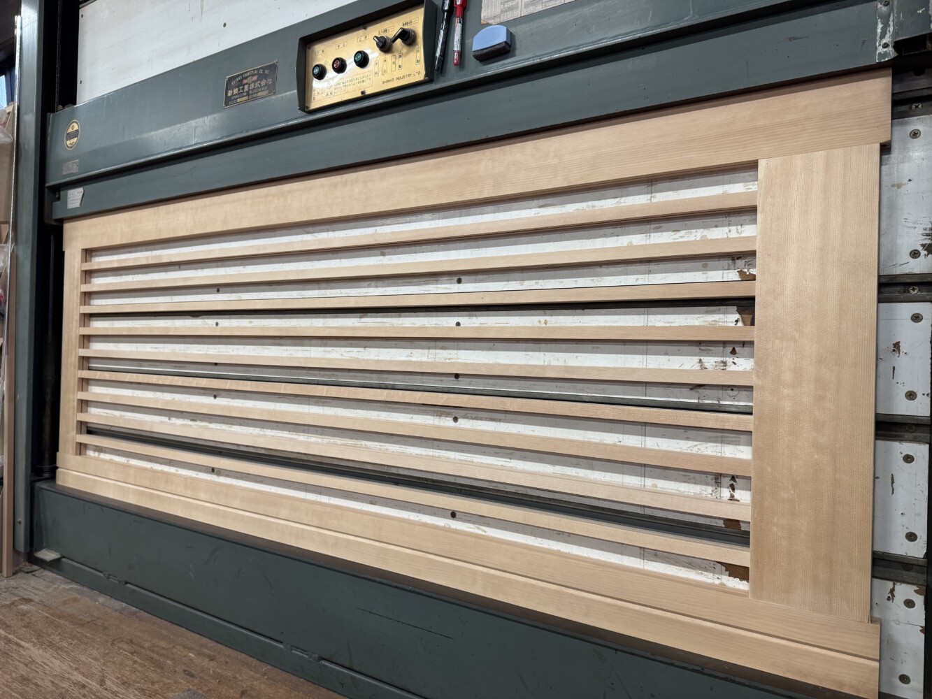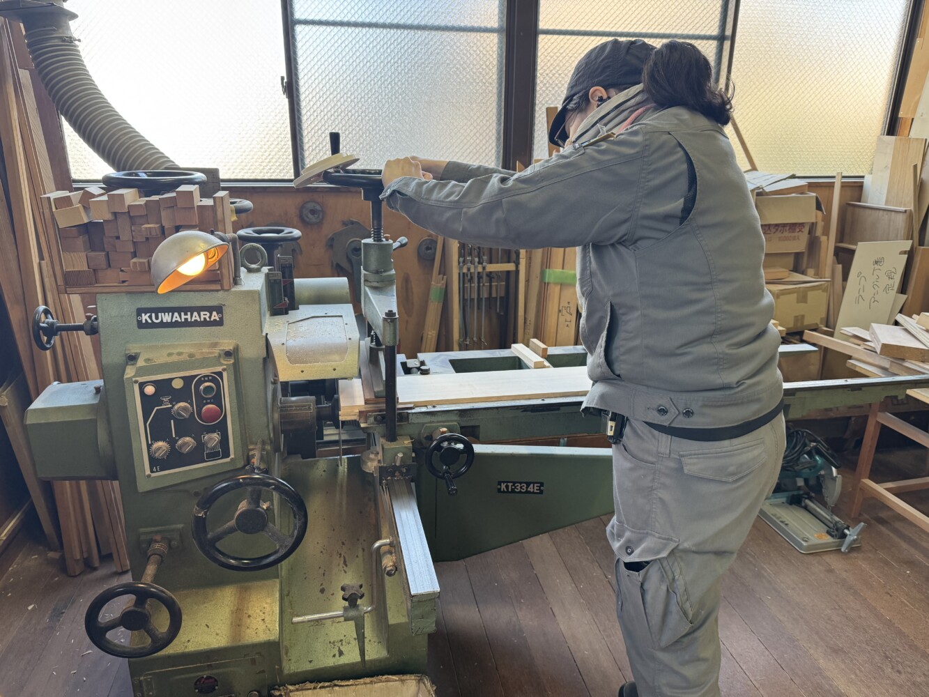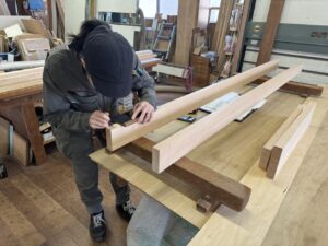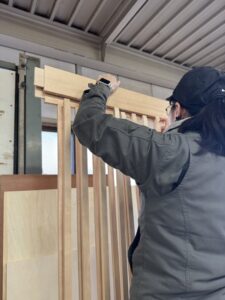 今回は、社員のHさんに通しで製作をしてもらいました。作り方の基本は大体障子も硝子戸も一緒なので、前回の製作を思いだしてもらいながら、私がついて説明しつつ全て加工をしてもらいました。