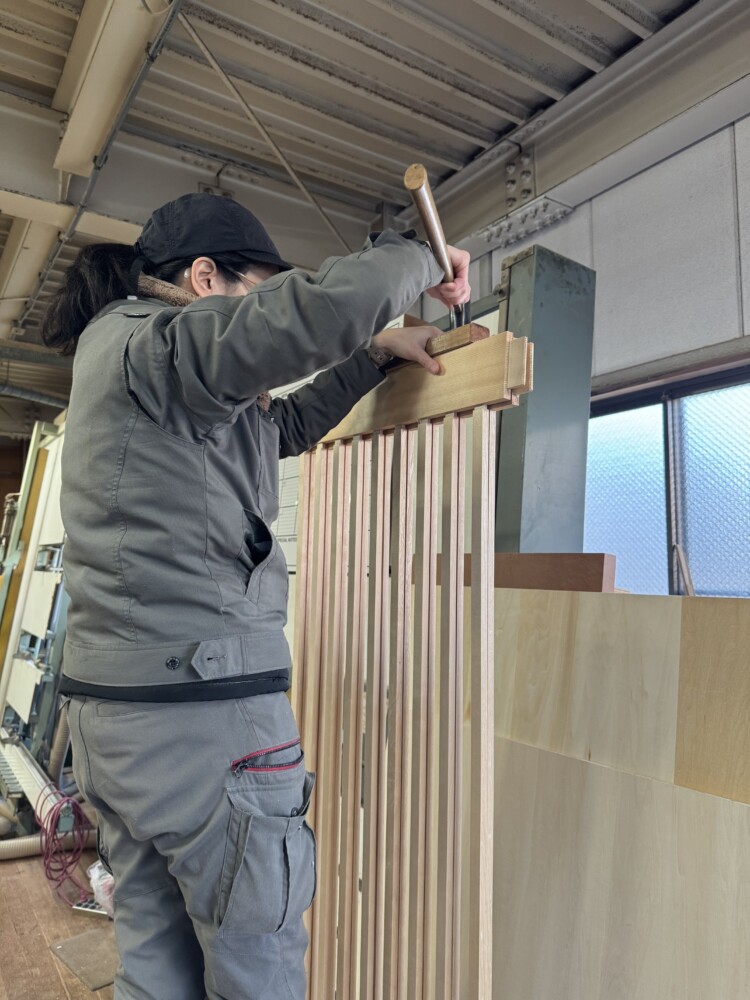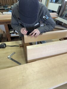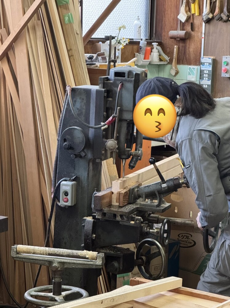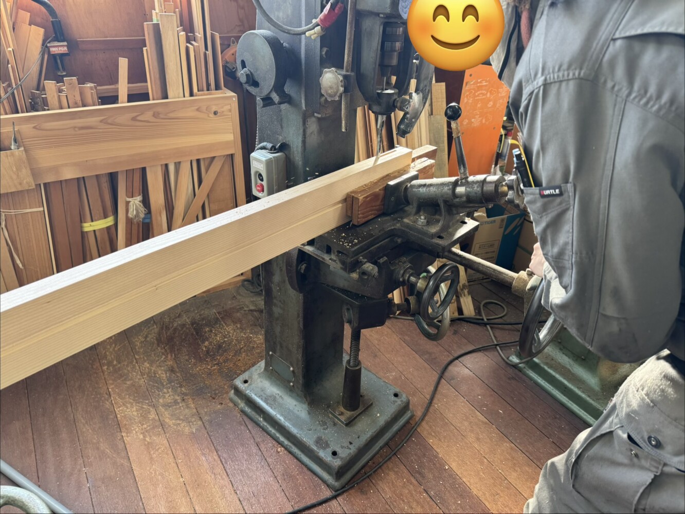 縦框にホゾ穴を掘り堀り。白柿で引いた線からはみ出さないいように。慎重に掘っていきます。