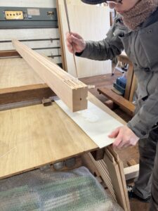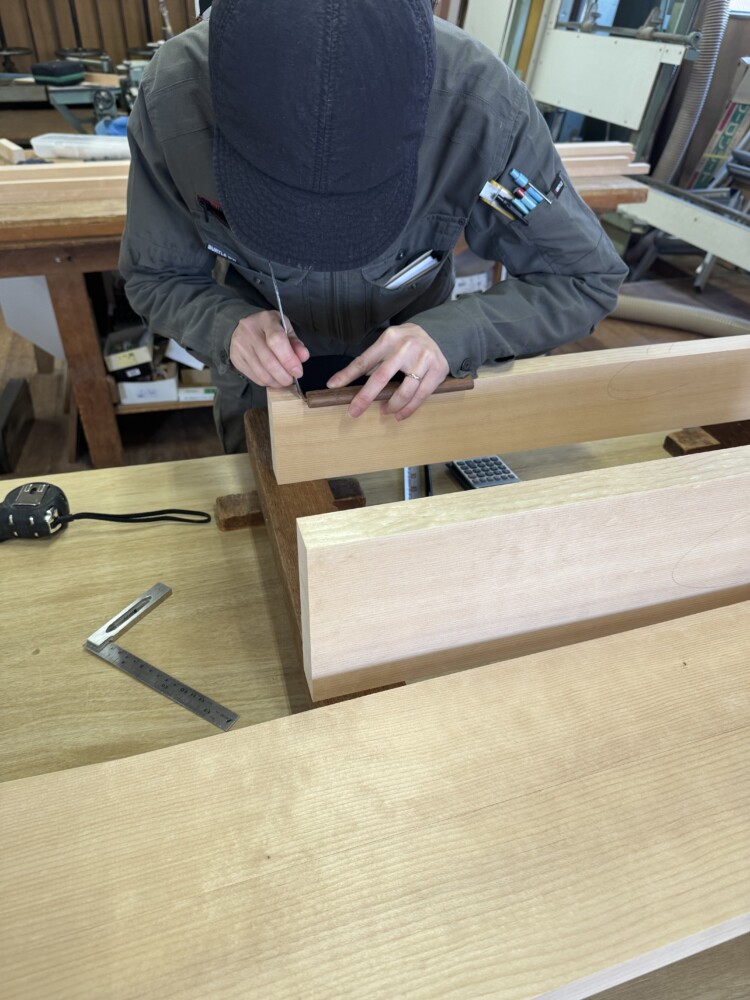 スプルースを加工して、白柿でホゾ穴を掘る位置を出します。